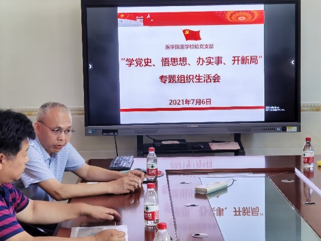 7月6日下午三点,我院医学检验党支部党史学习教育专题组织生活会在办公楼四楼会议室召开,会议由支部书记袁仕善主持,检验系全体党员参加。